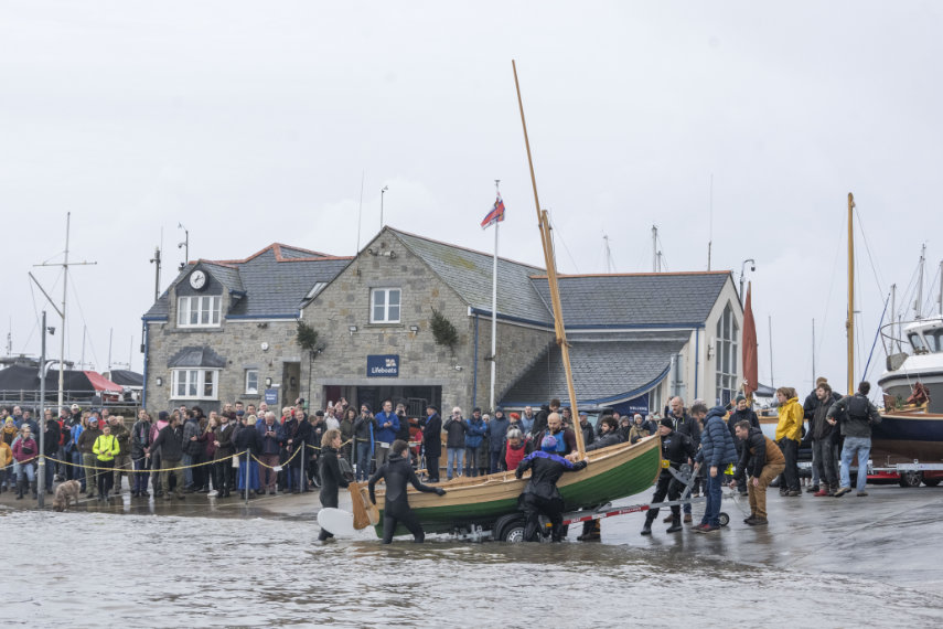 Students from the Boat Building Academy launched four boats into Lyme Regis Harbour.