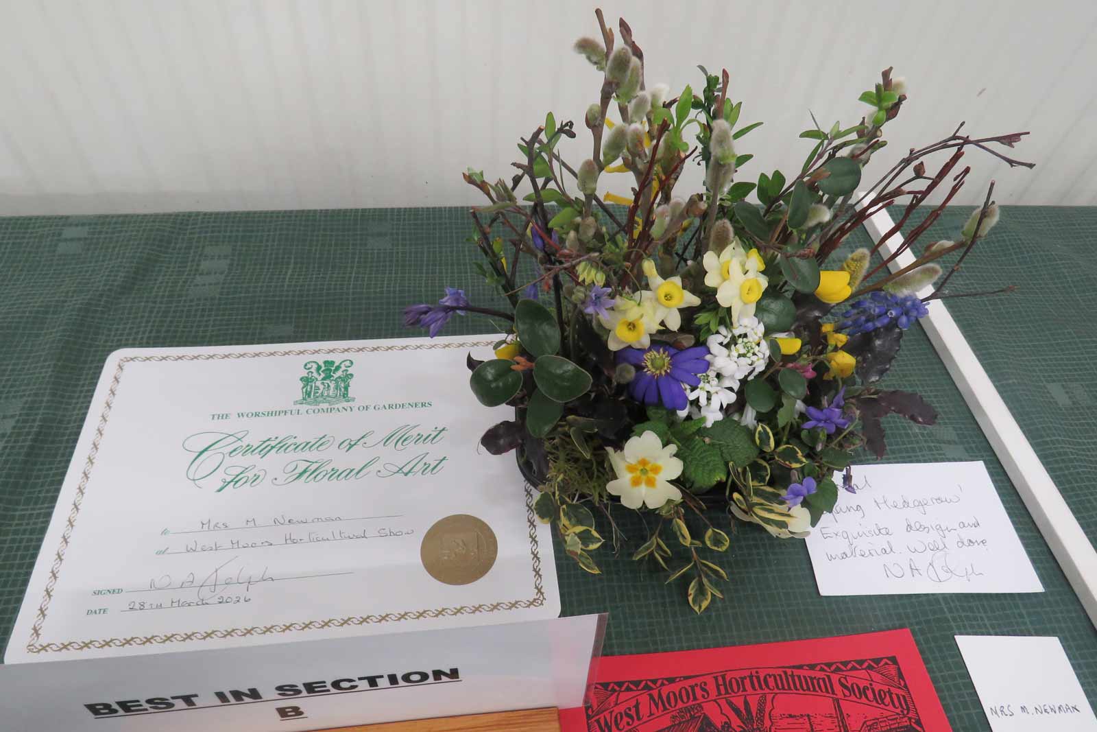 Mrs M Newman received a Certificate of Merit for Floral Art for her small-scale ‘Spring Hedgerow’ flower arrangement.