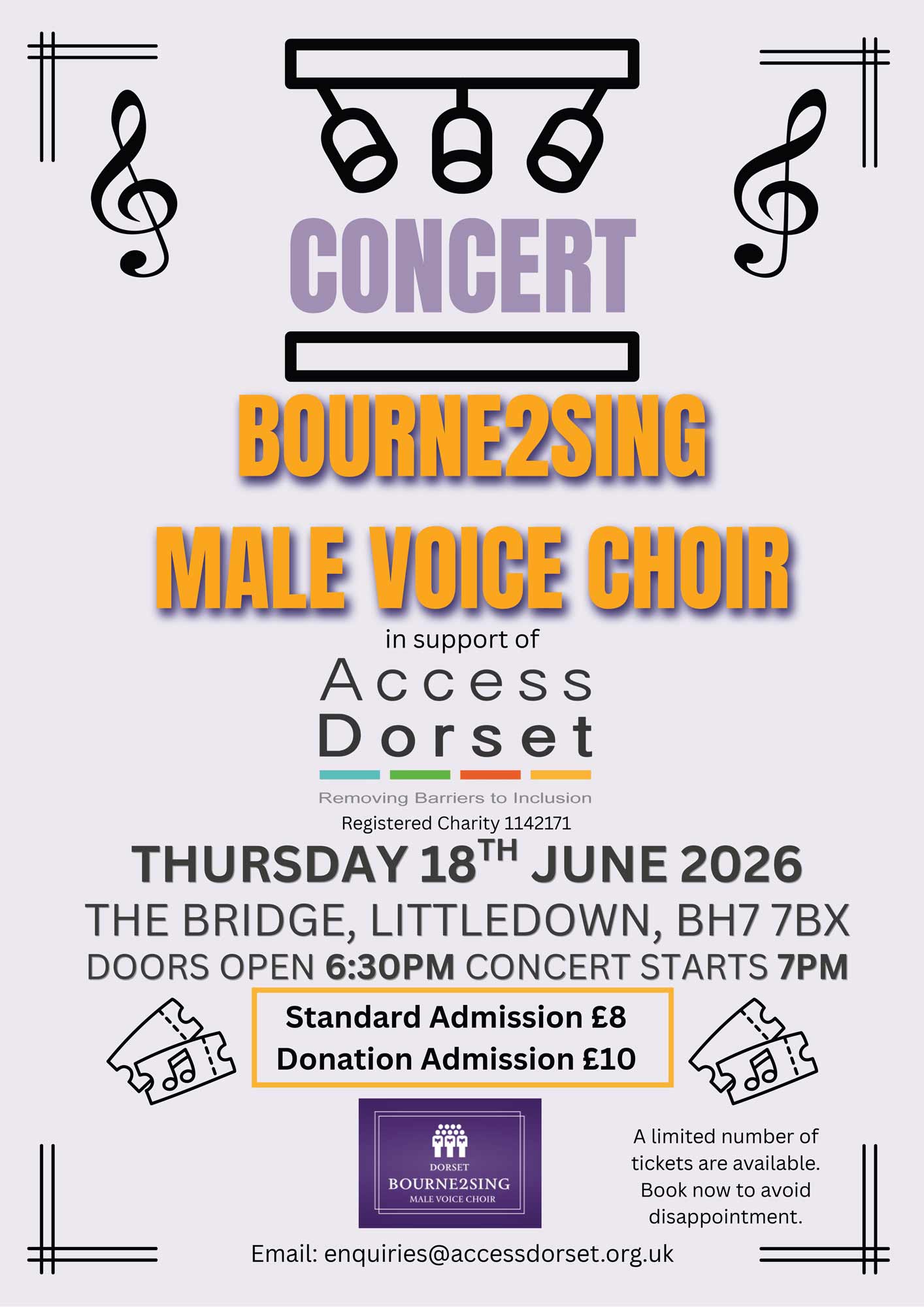 Bourne 2 Sing male voice choir will perform at a fundraising concert for Access Dorset on Thursday 18 June from 7pm–8.30pm.