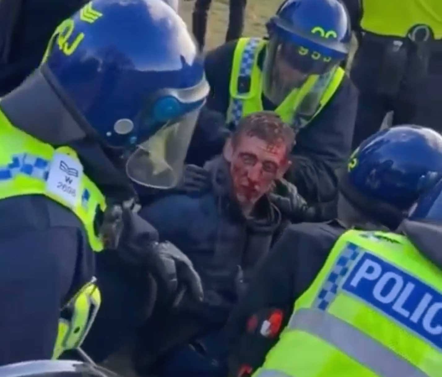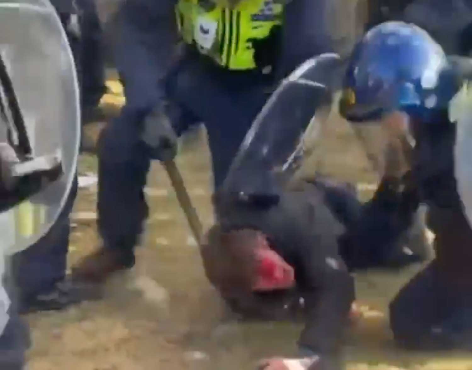 In videos shared with Dorset View, police can be seen striking with shields and batons. In one video, a man is pulled from the crowd and pinned to the ground by several officers, and blood can be seen across his face. In a separate video, what appears to be the same man is carried away by police.
