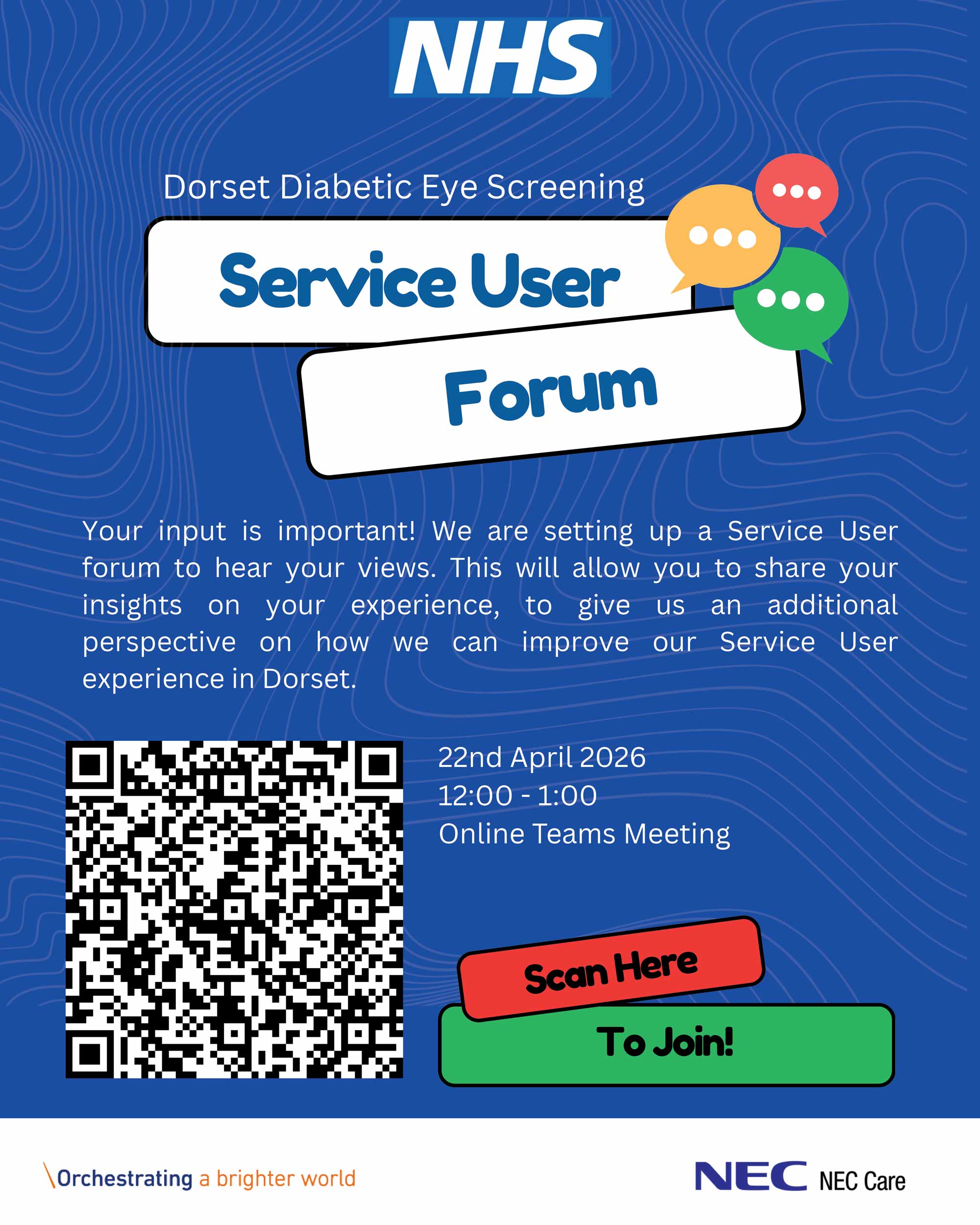 Organised by the NHS-run Dorset Diabetic Eye Screening Programme, the aim of the forum is to bring service users together to have their say and express their thoughts on how to improve the experience for people who need to use the service in Dorset.