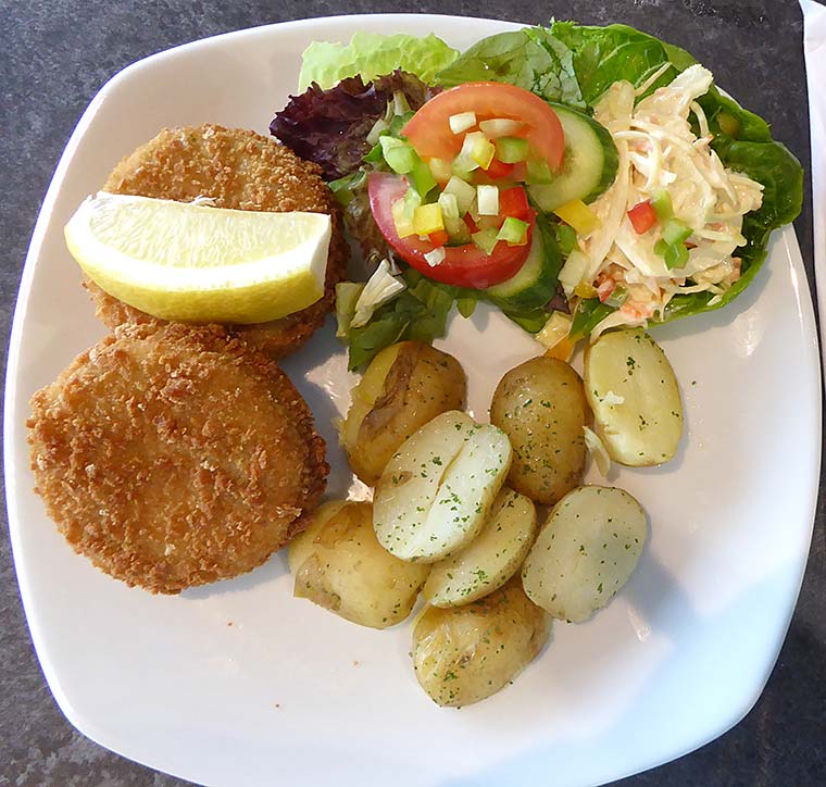 Our waiter whisked away our empty plates and our main courses soon arrived; Paul had gone for the homemade chargrilled Dudsbury burger in brioche bun with Cheddar cheese and fries, while I had selected salmon and broccoli fishcakes, salad and new potatoes from the specials board. The homemade salmon fishcakes were really crunchy on the outside and had goodsized pieces of fish inside. They tasted as good as they looked and I definitely recommend them if they come up on the menu again. The salad was extremely fresh, not some limp leaves that you sometimes get offered in restaurants. Paul’s burger was of a high standard and was soon demolished.