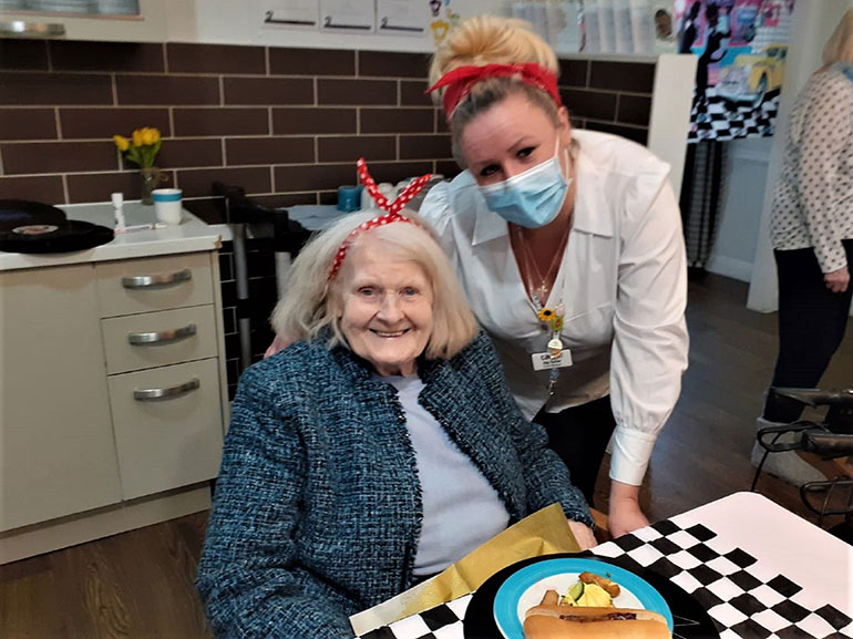 Residents and team members at The Potteries in Poole chose to take a step even further back to the 1950s. Their special celebration included foods homemade Spam on crackers, pineapple upside-down cake and fruit kebabs, as well as residents’ favourite songs from the time.