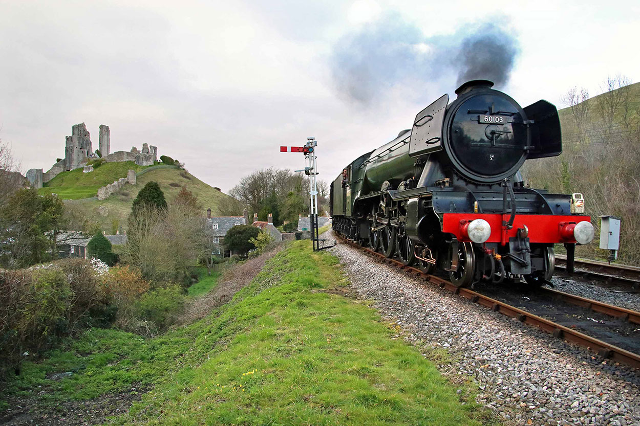 Caption: ‘Flying Scotsman’ on Swanage Railway passing iconic ruins of Corfe Castle © Andrew PM Wright