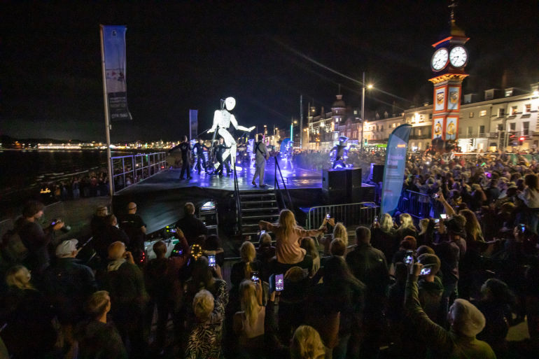 There were street performances of outdoor circus and dance in Poole and Christchurch, and the festival was brought to a spectacular finale in Weymouth with two performances of the promenade show Sense of Unity featuring the UK-based Worldbeaters drumming team and the mesmerising giant puppets of Dundu, from Germany. Thousands flooded the streets to watch the story unfold and reach its climax in front of the Jubilee Clock.