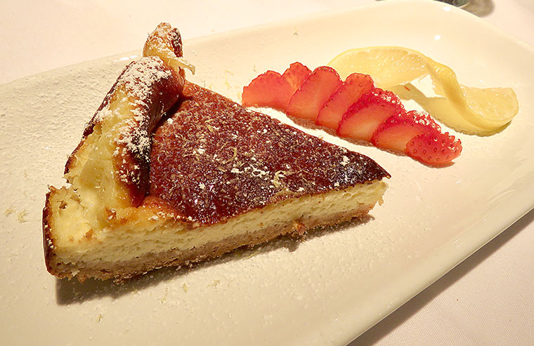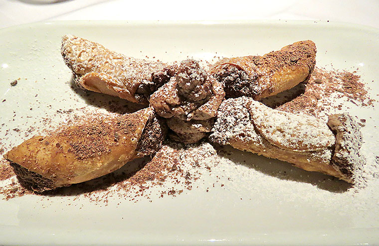 For dessert Nick chose Cannoli Siciliani – biscuits filled with chocolate and cream and I decided on home baked lemon cheesecake. I would say after such spectacular and tasty first and second courses, the sweets were interesting and different. Show-stoppers, definitely, but I wanted a drizzle of cream or quenelle of ice cream with my cheesecake (oh how English I am) to help it down. Nick’s dessert was crispy, crunchy, creamy and delicious.