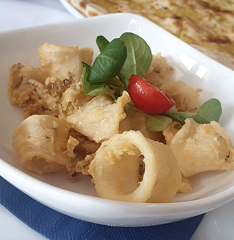 For starters Ramjan had Gamberi Con Pomodorini; king prawns in garlic and cherry tomato sauce and I ordered the Calamari Fritti which is crispy squid. We wanted to try some garlic bread made in their pizza oven, which was light and fluffy with olive oil drizzled on it.