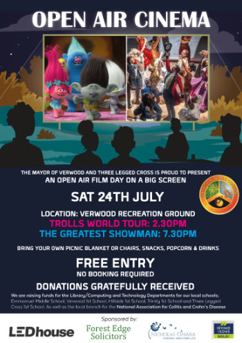 Take along your chairs and picnic and enjoy a film afternoon or evening at Verwood Recreation Ground on 24 July.