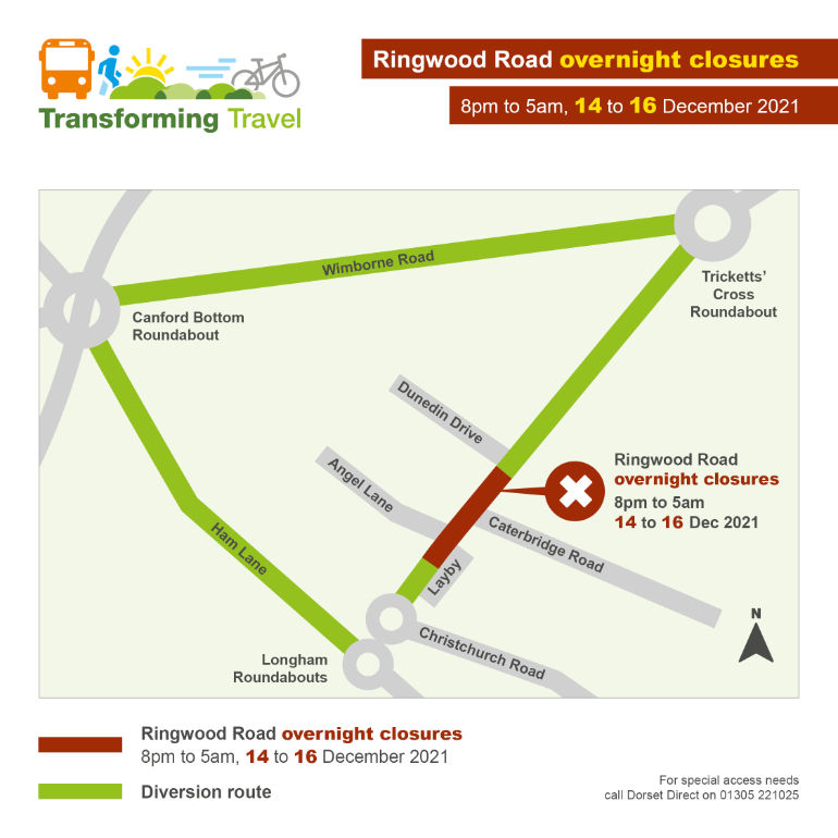 During these night-time closures, a diversion will be in place from the Longham roundabouts, along Ham Lane, Canford Bottom roundabout, Wimborne Road, Trickets Cross roundabout and back along Ringwood Road.