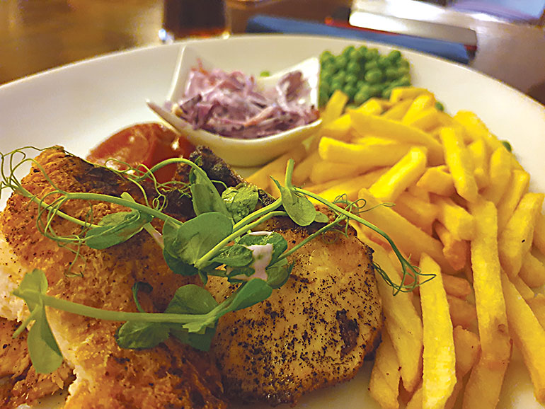 Between us we ordered Chicken Supreme with fries and coleslaw, two Catch of the Day, which was Cod Loin with sautéed potatoes, greens and Romesco sauce as well as fish goujons with chips and peas for the younger ones.
