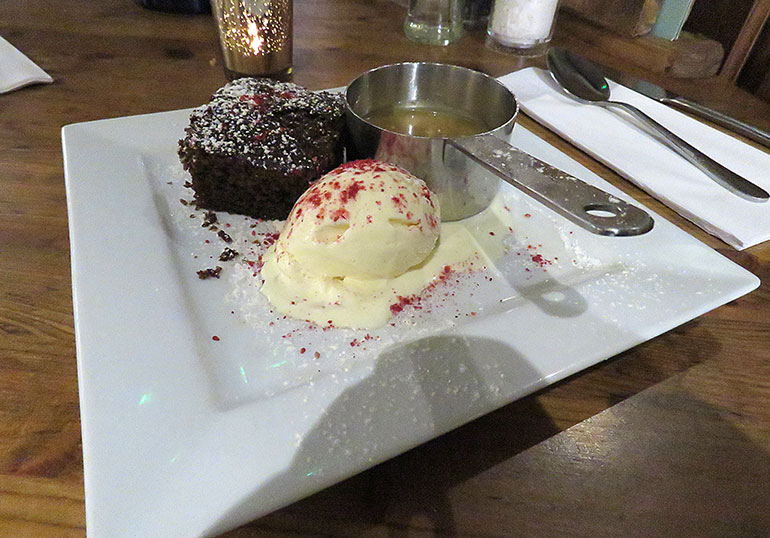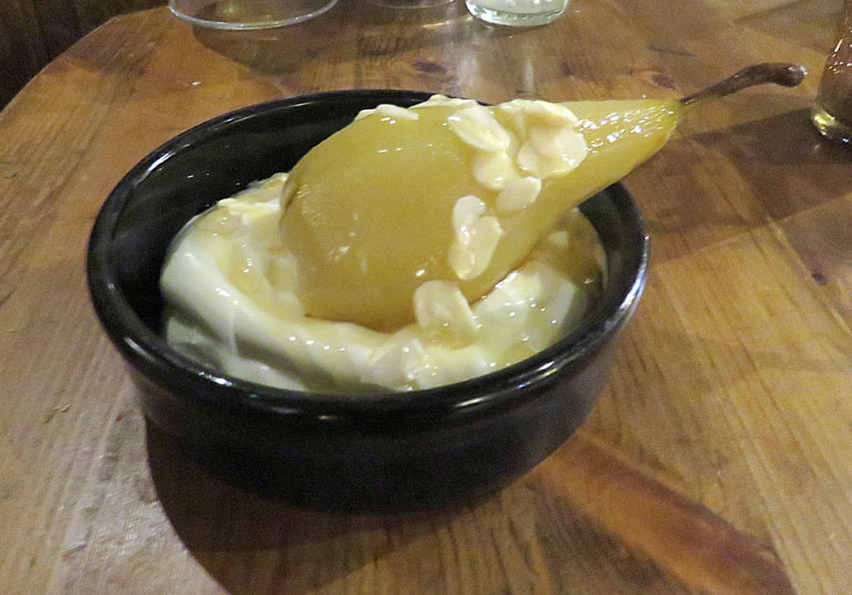 With clearly less room than me, Connor went for the poached pear with Greek yogurt. The fruit was as soft as my ice cream and along with the honey and yogurt topped with almonds it made for a light, yet tasty, third course.