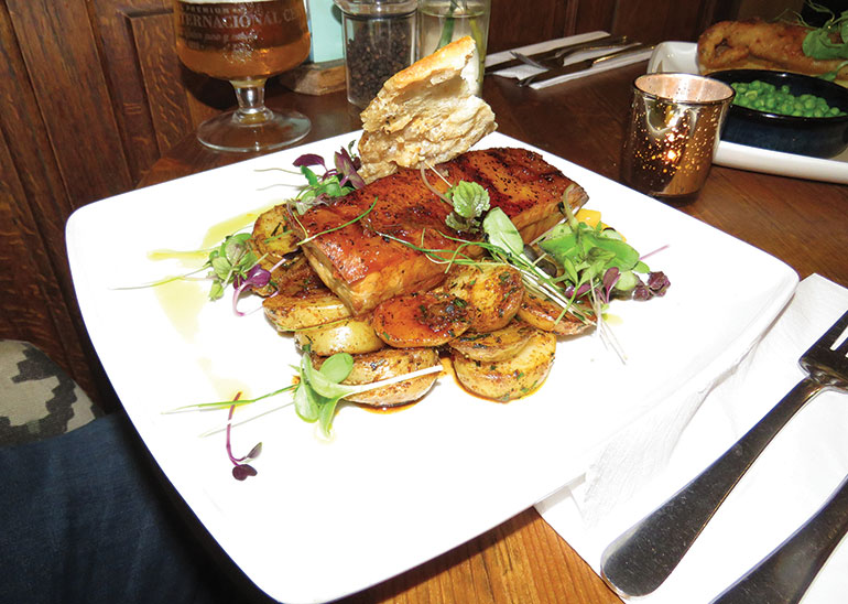 Quickly after that came the mains, fish of the day for me while Connor went for the Jack Daniels pork belly. The Wadworth beer battered fish couldn’t have been crispier, just the way it should be, and came with equally crispy chips as well as a healthy portion of peas and tartare sauce.