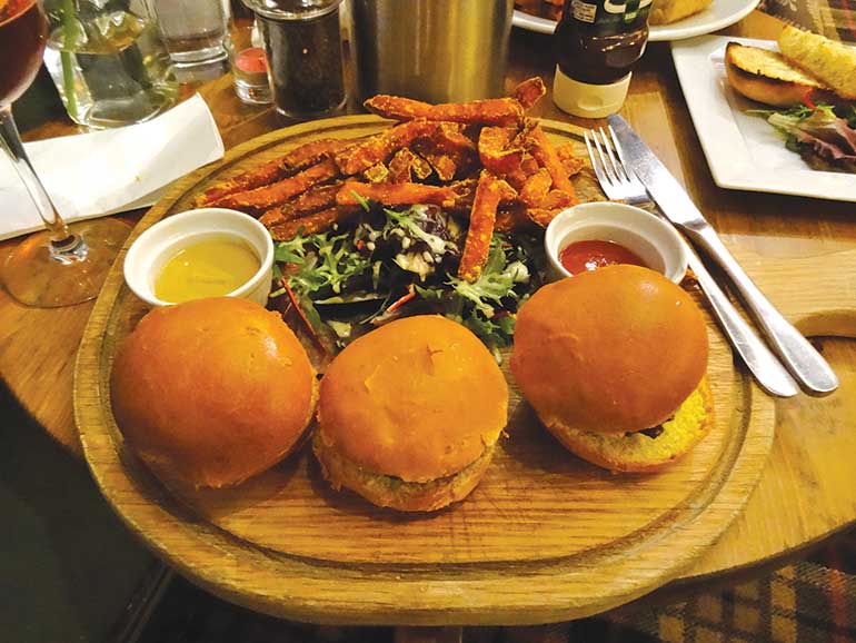 Our mains were just as delectable, deciding to go for what seemed to be two of the more popular items on the menu, the Rack of barbecue ribs with corn on the cob, sweet potato fries and dressed leaves and the Trio of mini burgers – beef with bacon and cheese, pork and apple and minted lamb burgers in brioche buns with sweet potato fries, mustard and ketchup. Both meals were large in size and well worth the wait.