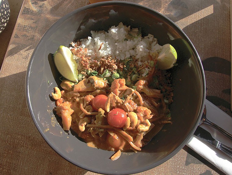 As for my Thailand Dream, it was crammed with ingredients, not least of which was coconut milk. I discovered bamboo, cauliflower, broccoli, mushrooms, tomatoes, peanuts and fresh mint, and there were slices of tangy lime served with a portion of plain rice.