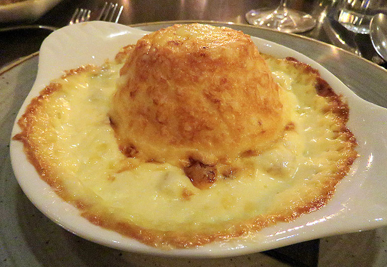 Mine was more of a challenge, yet irresistible – Alex’s twice-baked cheese soufflé – it had been highly recommended by a fellow cheese-lover. It’s a dish you could easily choose as a snack at lunchtime. For me, it needed salt, but it was gloriously cheesy and simply melted in the mouth. Surprisingly it had smoked haddock in it, which I hadn’t ordered, (that is an extra), but what a delightful pairing.