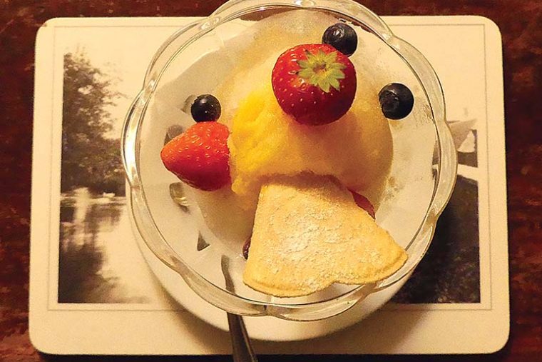 In contrast, I liked the sound of the Chicken cooked with garlic, rosemary and black pepper. I had so nearly chosen King prawns wrapped in bacon, which sounded equally delicious. Without exaggeration, I can tell you this was the moistest, tastiest chicken I have ever encountered. The secret’s in the cooking, according to the other Paul – the owner and chef. It was served with creamy Dauphinoise potatoes and fresh vegetables – a lovely melée of lightly al-dente vegetables. Mr W commented that his fillet steak was perfectly cooked and he enjoyed the surprisingly subtle flavours in the blue cheese sauce.