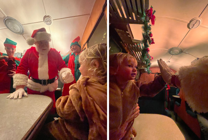 Just as things were firing up, the train started to slow, but this was only to bring more magic to the ride as elves started prancing past the windows, waving and enticing the passengers to what was to come next. A quick glance out of the window would leave any child speechless as the train had arrived at the ‘North Pole’, Santa’s sleigh, bright lights and elves scattering the scene. The Jolly Red Fellow made a surprise appearance in person and greeted each passenger as they asked him questions and he collected their Christmas lists, handing out a bell as a present for each person to jing-a-ling on the journey home!