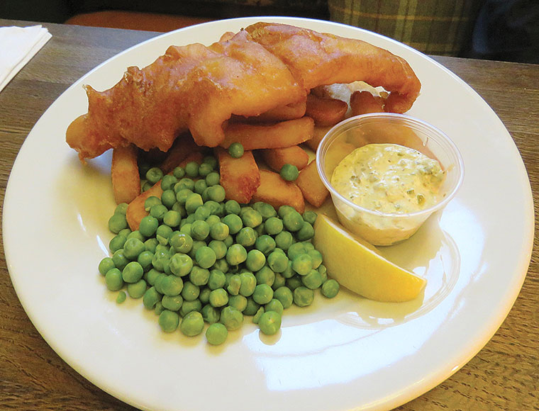 A fish of the day coated in Wadworth beer batter, served with chips, peas, tartar sauce and lemon arrived for hungry Ben. The cod looked handsome in its dark, crispy coat, and wasn’t long on the plate, neither were the chunky chips that simply melted in the mouth. Ben now admitted that he was feeling rather full, but even so, he ordered a pint of Muddy Boot and we swapped chauffeur duties.