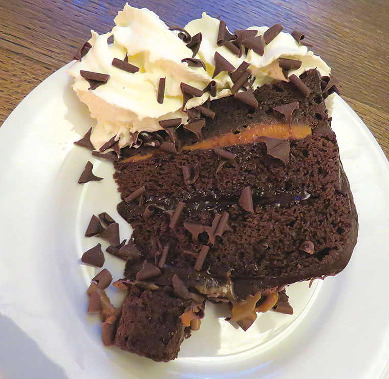 Firstly, the chocolate crunch dessert had just run out and secondly, I couldn’t contemplate having a lemon meringue to myself. Instead we agreed to order one portion of chocolate fudge cake filled with sweet salted caramel sauce and a layer of chocolate fudge, coated in chocolate fudge icing with brownies. When asked if we would like custard, ice cream or cream, I couldn’t believe my ears when Ben asked for CREAM!