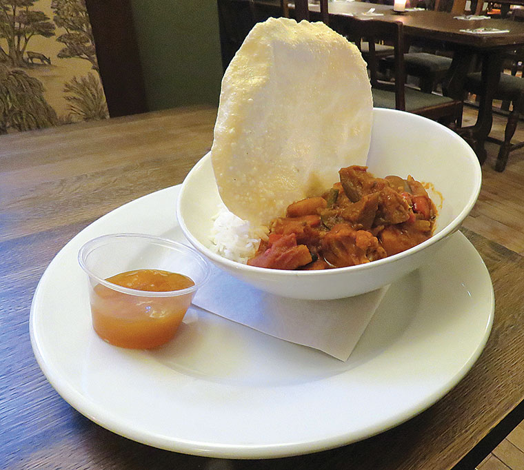 Once moored on the table, my spiced vegetable curry with basmati rice, and a glorious poppadum sail was a visual feast. The vegetables were large and crunchy and included green beans, courgette, aubergine, red and green peppers and cauliflower. The rice was light and fluffy and the fiery heat of the curry warmed the mouth and left an after burn, which was somewhat sated by the mango chutney. Despite its deliciousness, the portion defeated me.