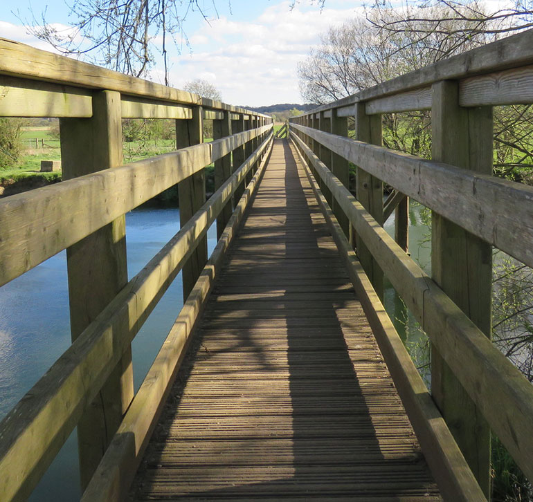 Approach the River Stour by foot and turn right to Eye Bridge, which is close to the car park. The narrow wooden bridge can only be crossed on foot. We walked onto the bridge to look towards a small weir and spotted an egret. We didn’t cross over. Instead we descended on the same side and continued along a level path that follows the river. The river was on our left and a field on our right, which had a few large rabbits in it. The ground was level and accessible for wheelchairs and we saw someone walking easily with a rollator.