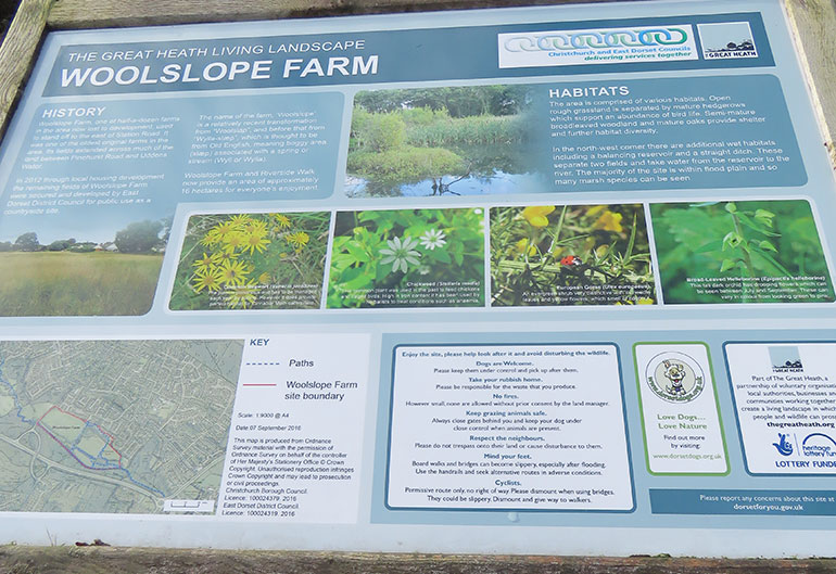 Entrances to Woolslope Farm gravel paths are either directly off the Riverside Walk (accessed from the A31, or Station Road, West Moors but there is no parking at either location), or via Canterbury Close or Woolslope Road. Again, there are no car parks, so it’s better to walk to the entrances if you can.